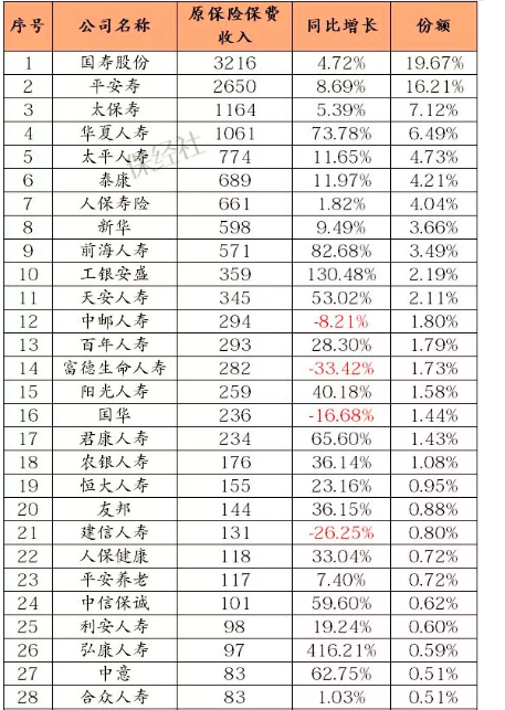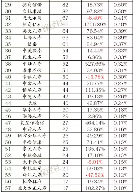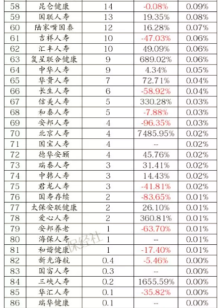 从保险公司看,前四家公司市场份额接近50%。在91家公司中,20家负增长。