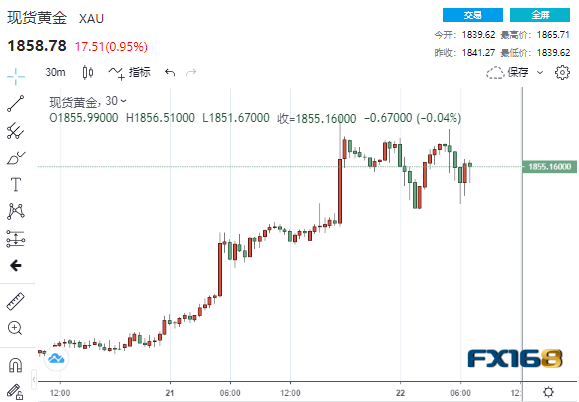美市盘中,现货黄金短线拉升逾12美元,至1860美元/盎司关口略下方,盘中稍早曾触及2011年9月以来最高位1865.71美元/盎司。