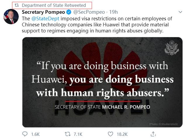 蓬佩奥在推特上宣布了国务院的签证限制措施。他在推文中写道:“国务院对华为等为全球侵犯人权的政权提供物质支持的中国科技公司的某些雇员实施签证限制。”