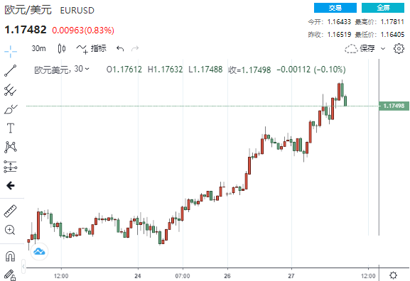 欧元/美元上涨0.87%,报1.1755,稍早一度达到1.1781,为2018年9月以来的最高水平。