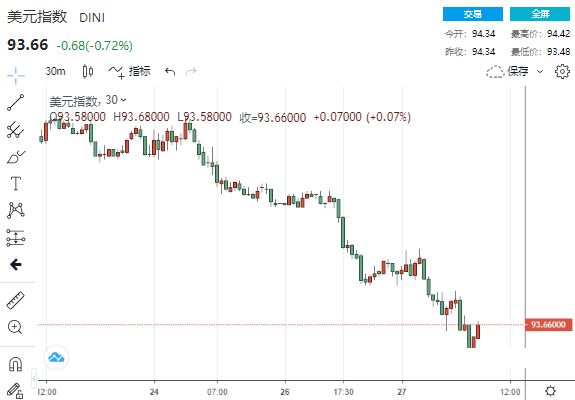 美元指数下跌至93.48,为2018年6月以来的最低水平。