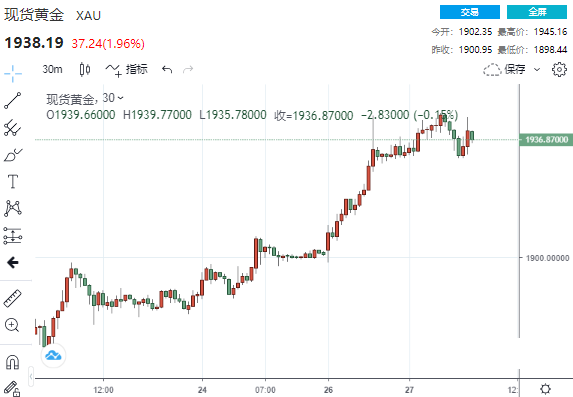 美市盘中,现货黄金价格上涨近2%,交投于1940美元/盎司关口略下方。日内稍早,现货黄金一度触及1945.16美元高点,超过了2011年9月创下的上一个纪录高点。