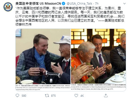 美国大使馆在推特上发布了一段中文视频:“自1985年以来,美国驻成都总领事馆一贯很骄傲地努力促进美国人民与四川、重庆、贵州、云南和西藏人民的相互理解。我们会永远想念你们。”