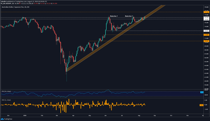 自3月触底以来,澳元/日元一直沿着数月来的上行通道上涨,不过其强势面临了考验,因为汇价步入了顽固的阻力区间75.925-76.320。未能成功上破这一阻力可能导致澳元/日元上行支撑通道失效,跌破这一支撑通道可能会令看跌动能加速进而拖累澳元/日元进一步下跌,接下来48小时将非常关键。