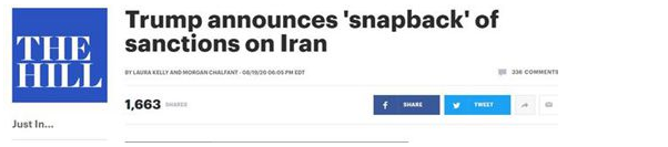 8月20日,美国国务卿蓬佩奥访问联合国,告知秘书长及安理会主席,要求安理会启动“快速对伊恢复制裁”机制,在30天内对伊朗恢复国际制裁。安理会绝大多数成员国认为,美国已经单方面退出伊核协议,美方要求不具备任何法律基础。