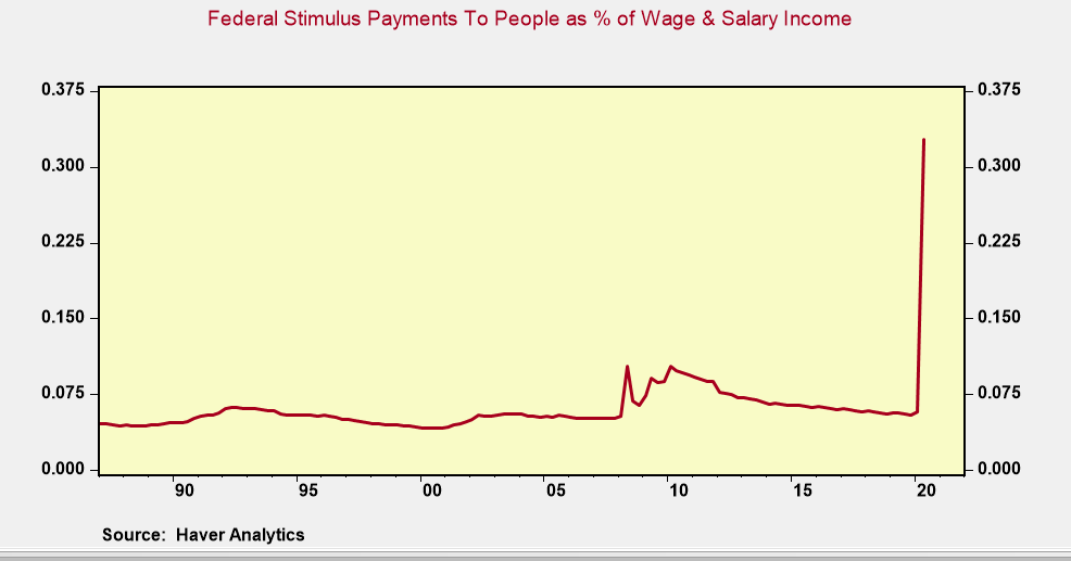 在二季度,美国政府给个人(及小企业)的特别付款达到了该季度工资和薪金收入的25%。这意味着工作和赋闲的人每获得4美元的工资和薪金收入,就能从联邦政府那里再获得1美元。