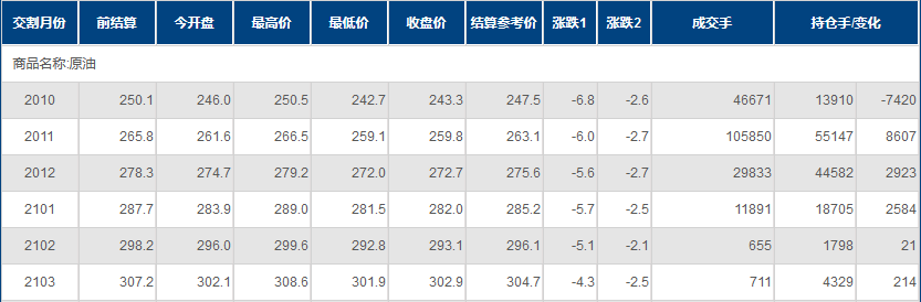 上海原油价格下跌。主力合约2011,以259.8元/桶收盘,下跌6元/桶,跌幅2.26%。全部合约成交195734手持仓量增加6969手至139803手。主力合约成交105850手持仓量增加8607手至55147手。