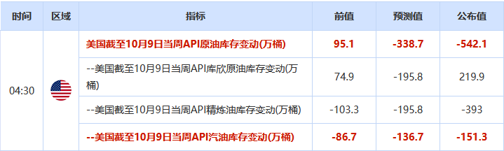 美国石油协会(API)公布的数据显示,美国截至10月9日当周API原油库存减少542.1万桶,预期减少338.7万桶;汽油库存减少151.3万桶;精炼油库存减少393万桶