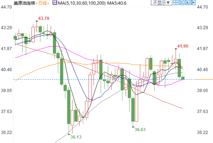 技术面来看,美油未触碰震荡区间上沿,显示仍处于38-43美元/桶的区间,将在38附近获得强支撑。