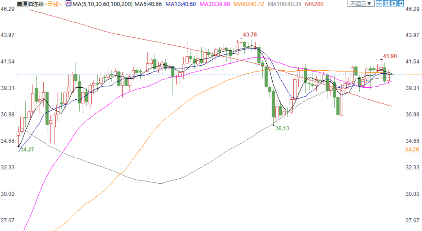 技术面来看,美油40美元下方买需犹在,且仍处于收缩震荡整理阶段,中期维持38-43美元/桶的区间交易。