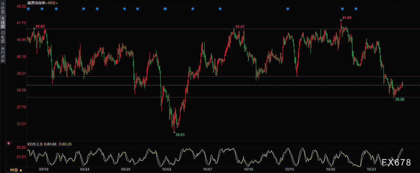 60分钟下来看,原油走势跌破上方通道线,下方支撑位在38.28,上方压力位38.24,目前仍然处在中间位置,最好等待机会做高抛,胜率更大。