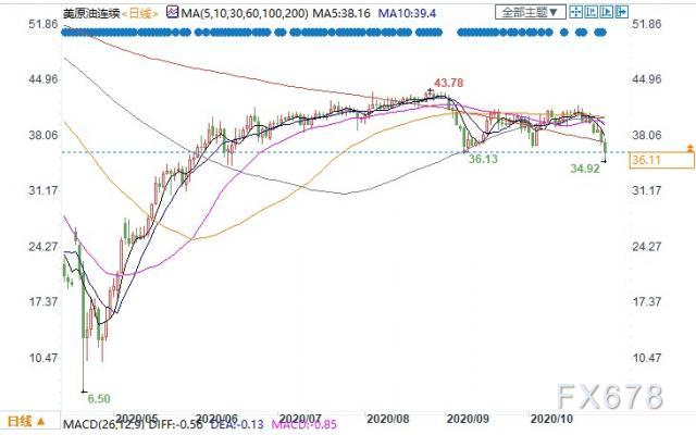 美国WTI 12月原油期货电子盘价格周四(10月29日)收盘下跌1.28美元,跌幅3.42%,报36.11美元/桶。油价周四再度大幅下挫,因欧洲多国实施封锁措施,且其他地区的新冠病例激增给需求前景蒙上了阴影。