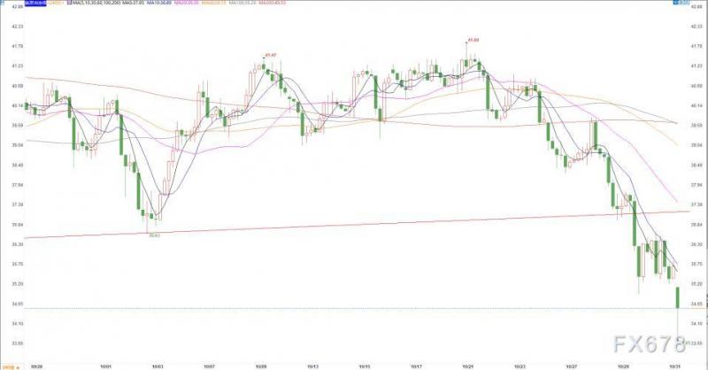 周一(11月02日)亚盘时间段,美原油再度大跌,日线级别连续4日下行,创5月内新低,现报34.56美元/桶,跌幅约3.6%,因市场预测特朗普或将连任美国总统,这将导致美国经济刺激规模很可能缩小,不利于美国经济的复苏,利空原油。新冠感染人数激增,法国和德国宣布新的封锁措施,加剧了市场的担忧情绪。原油价格大幅下滑,有OPEC消息人士称,沙特和俄罗斯赞成将目前约770万桶/日的减产延续到明年,减产幅度高于之前的协议,这有利于原油价格止跌。