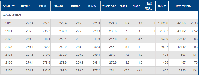 上海原油价格下跌。主力合约2012,以221元/桶收盘,下跌6.4元/桶,跌幅2.81%。全部合约成交269404手持仓量增加2546手至129443手。主力合约成交168258手持仓量减少2633手至42866手。