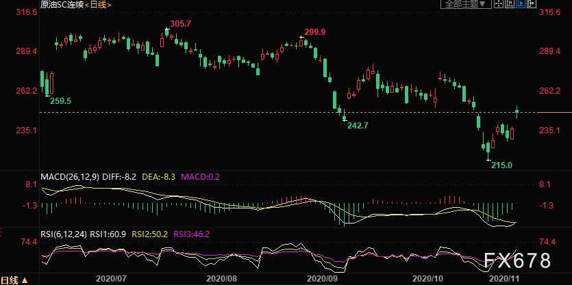 周二(11月10日)上海原油价格暴涨,主力合约2012以248.1元/桶收盘,上涨14元/桶,涨幅5.98%,盘中创10月28日以来新高至252.2元/桶。因美国制药巨头辉瑞宣布其实验的新冠疫苗可预防90%以上的有症状感染,这被认为是巨大利好,有望解放欧美被重创的经济,从而改善原油需求。另一方面,沙特阿拉伯暗示它和其他石油生产国可以调整其目前的减产协议。
