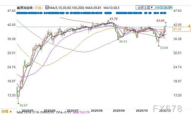 美国WTI 12月原油期货电子盘价格周三(11月11日)收盘上涨0.06美元,涨幅0.15%,报41.42美元/桶。油价周三延续上涨态势,因市场寄望新冠疫苗可能提振需求,但随后回落,因对病例增加的担忧盖过了利好消息。