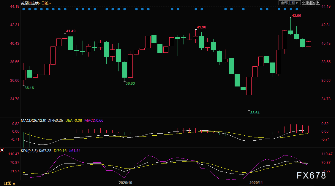 周一(11月16日)亚洲时段,美原油震荡上涨逾1%,目前交投于40.63美元/桶附近,上周末的消息显示,特朗普基本上已经无力扭转败选的局面,市场担忧情绪降温,美国股指期货走高创一周新高,也给原油等大宗商品提供上涨动能;另外,市场还普遍预期OPE+未来将延缓缩减减产规模的时间,也给油价提供支撑;不过,欧美新冠疫情进一步恶化,原油需求前景收到压制,再加上美国原油钻井数据增加,利比亚增加产量,油价的上涨空间仍受到限制。