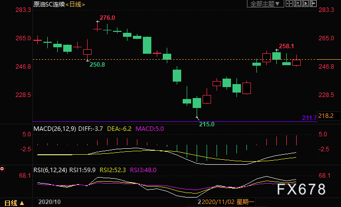 周一(11月16日)上海原油价格小幅下跌,主力合约2012以251.9元/桶收盘,下跌0.3元/桶,跌幅0.12%,此前由于拜登顾问排除全国封锁一度推升油价涨近1%,日线上已收复上一交易日全部跌幅。特朗普基本上已经无力扭转败选的局面,市场担忧情绪降温,美国股指期货走高创一周新高,也给原油等大宗商品提供上涨动能;另外,市场还普遍预期OPE+未来将延缓缩减减产规模的时间,也给油价提供支撑;不过,欧美新冠疫情进一步恶化,原油需求前景收到压制,再加上美国原油钻井数据增加,利比亚增加产量,油价的上涨空间仍受到限制。