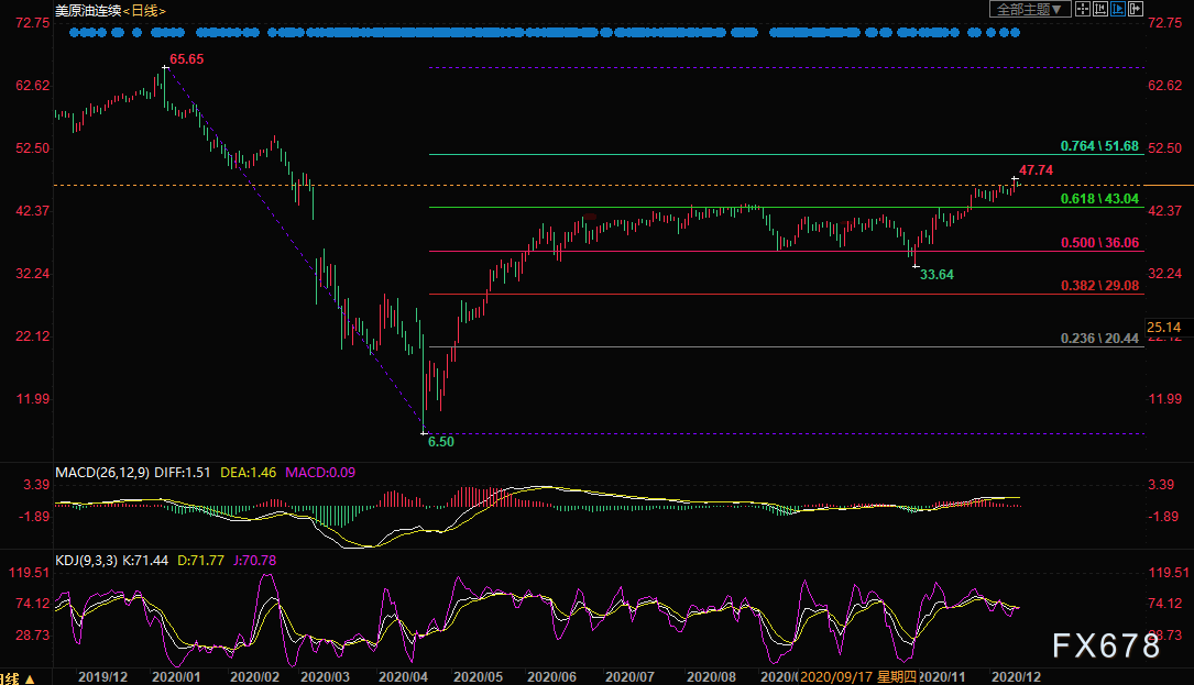 周一(12月14日)亚洲时段,美国原油小幅上涨,交投于46.87附近,受新冠疫苗上市将提振全球能源需求的憧憬支撑,英国脱欧谈判延长也缓解了相关忧虑。油价已经连涨六周,创6月以来最长连涨纪录。