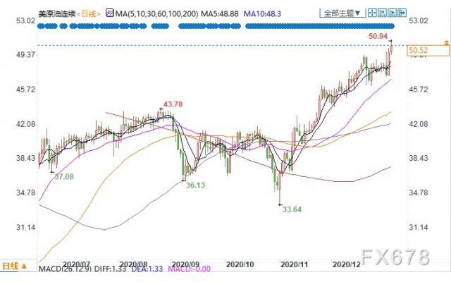 美国WTI 2月原油期货电子盘价格周三(1月6日)收盘上涨0.59美元,涨幅1.18%,报50.52美元/桶。油价周三升至2月以来最高水平,此前沙特宣布自愿大幅减产,且美国原油库存骤降。