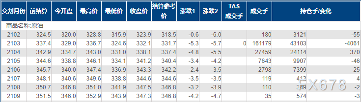 上海原油价格下跌,主力合约2103终盘收于332.1元/桶,跌5.3元/桶,跌幅1.57%。