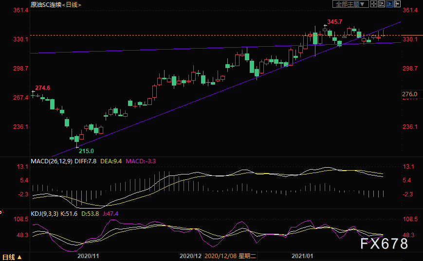 上海原油价格微涨,主力合约2103终盘收于335元/桶,涨1元/桶,涨幅0.3%。