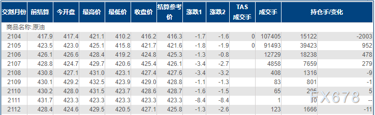 上海原油价格小幅下跌,主力合约2104终盘收于416.2元/桶,跌1.7元/桶,跌幅0.41%。