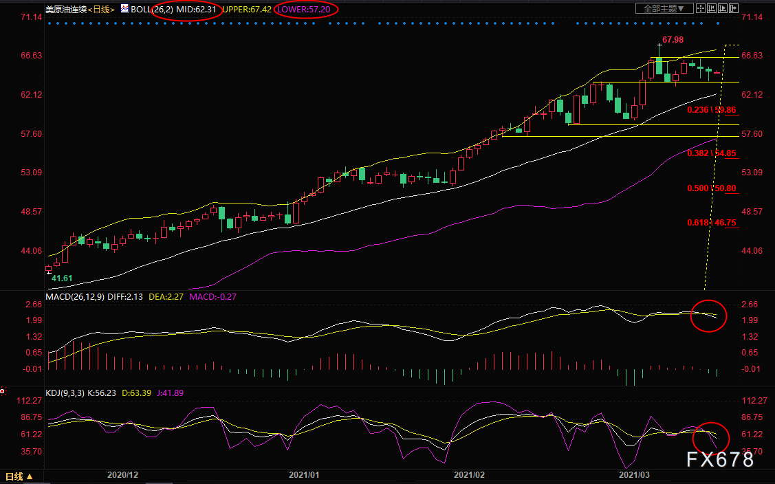 进一步支撑在60整数关口附近,然后是3月3日低点59.24附近,2月19日低点支撑在58.60附近,布林线下轨支撑在57.21附近。