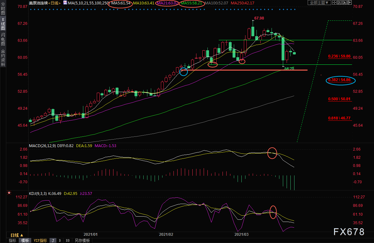 日线级别:震荡筑顶;MACD死叉,KDJ死叉,5日均线下穿21日均线,上周四大跌后的反弹受到5日均线压制,油价面临重回跌势的风险,初步支撑在60整数关口附近,3月3日大跌支撑在59.24附近,55日均线支撑目前在58.21附近(接近上周低点),若跌破该支撑,则增加中线看空信号。目前这种可能性较大。