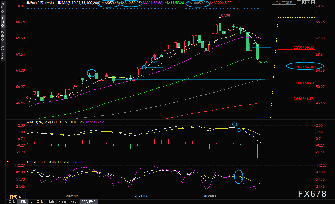 阻力位方面,55均线58.28位置已经转化为初步阻力所在,5日均线阻力在59.49附近,由于57.25附近支撑较强,短线油价仍可能反弹调整至该位置附近;但要扭转跌势,还需要更多的信号,周一的低点60.35和高点62.04位置,也可以予以关注。