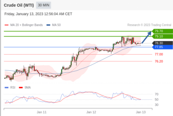 交易策略: 在 77.85 之上,看涨,目标价位为 79.10 ,然后为 79.70 。