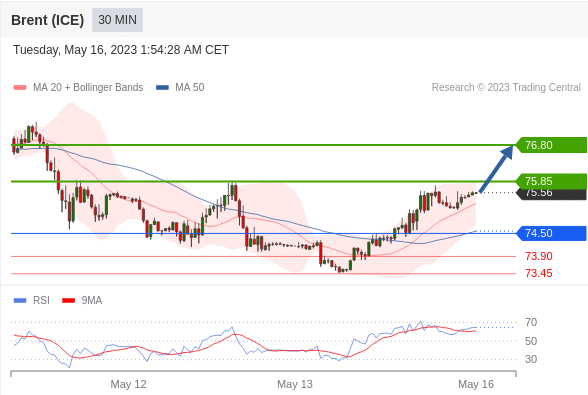 交易策略: 在 74.50 之上,看涨,目标价位为 75.85 ,然后为 76.80 。