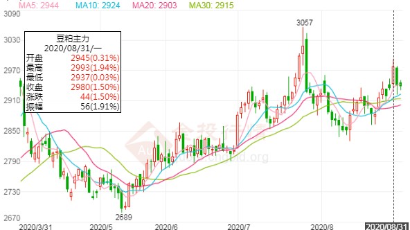 从豆粕行情走势可以,看到豆粕期货价格在3000元/吨附近是个大坎,4月份价格接近3000点出现了一波较为深度的回调,而在7月份价格继续接近3000点的时候,又分别在7月初和7月底进行了两次调整,而在前天豆粕期货价格追随美豆上涨,达到了2993元/吨,再次接近3000点,今天行情遭遇小幅调整,一波三折的豆粕行情特性,还会导致本次3000点附近还会出现深度回落吗?
