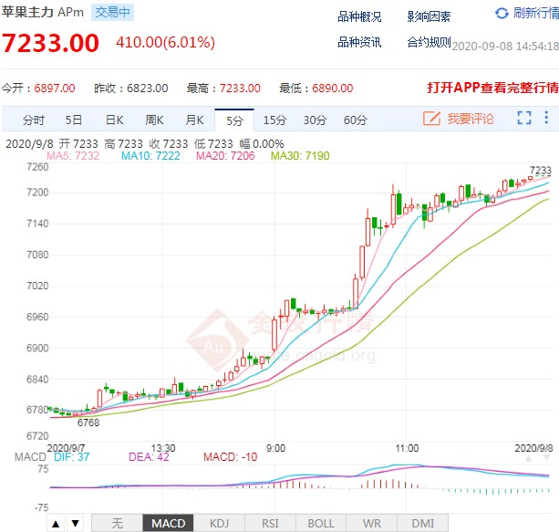 9月8日消息,苹果期货主力合约尾盘涨停,涨幅6.01%,报7233元。