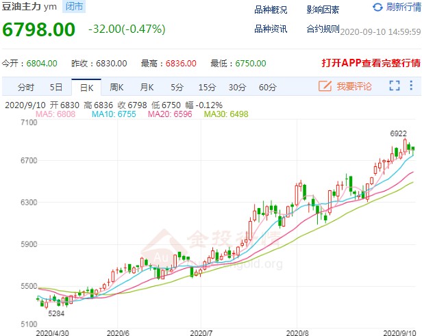 受美国中西部作物区旱情持续得不到缓解影响,美国大豆优良率由8月11日的74%下降到9月6日的65%,降幅之快在美豆生长的中后期并不多见。美国农业部曾在8月供需报告中预计2020年美豆单产为53.3蒲式耳/英亩,总产量为1.2042亿吨。显然结合当时的美豆生长状态,市场对美豆大幅增产普遍持有乐观预期。而随着美豆优良率持续下滑,各方对美豆产量回调担忧情绪也在持续加深。分析机构纷纷调减美豆单产和总产量,并预期美国农业部会在9月供需报告中下调美豆产量数据。受此影响,美豆价格开启了年内最大一波涨势,并带动包括中国在内的全球油脂油料价格整体回升。