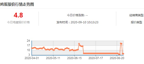 从具体的价格情况来看,监测显示,本周鸡蛋平均出场价为每百斤428.69元,比上周(2020年9月1日,下同)上升0.16%;价格自7月初开始振荡上行,累计升幅8.18%。受此带动,鸡蛋零售环节价格随之反弹,本周全省均价为每500克5.86元,比上周上升0.69%;价格自7月下旬起开始回暖、连升8周,累计升幅7.13%。