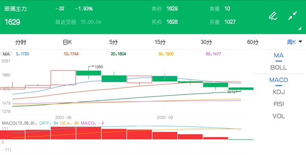 玻璃价格最新消息:8月下旬开始,玻璃期货01合约最高至1884之后以回调为主,周线价格重心下移趋势明显,截止上周玻璃期货价格跌破60日均线,多头趋势转弱。