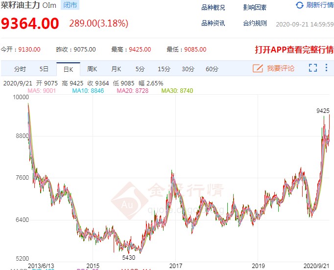 金期投资认为,需求强劲,供应不足是本轮菜籽油上涨的最直接动因。目前菜籽油消费进入旺季。6月以来,随着疫情在国内被基本控制,餐饮业迅速恢复。8月下旬后,大中院校陆续开学,油脂集团消费量增加,加之下游为国庆、中秋双节备货量增加,菜籽油进入了传统消费旺季。在消费预期转好的利多消息刺激下,菜籽油期货振荡上行,不断刷新7年来高点。