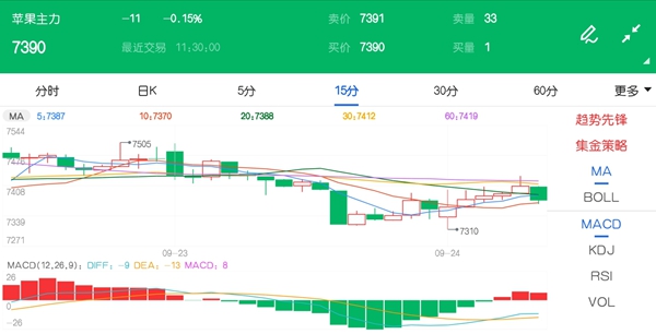 今日(9月24日),苹果价格最新消息:主力期货2101合约延续偏弱走势,截止午间收盘报7390元,走势小幅下跌0.15%;昨天,苹果期货主力2101合约高开后,在多头减仓影响下,期货价格弱势下行。此时,部分空头借机离场,期价止跌回稳。午后,空头增仓发力,期价快速下探,但在多头奋力抵抗下,苹果期货价格止跌并略有反弹。不过,日内仍以小幅下跌报收。