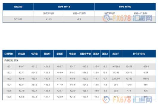 上海能源交易所原油期货价格大幅下跌。上海原油价格下跌。主力合约SC1903,以415.8元/桶收盘,下跌13.1元,跌幅为3.05%。全部合约成交412854手,持仓增加3358手至71228手。主力合约成交226000手,持仓量增加11852手至42796手。