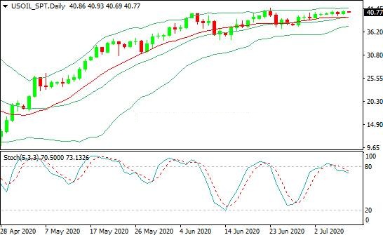 4小时图:保利加通道趋平,油价自上轨回撤;14和20均线温和看涨;随机指标走高。
