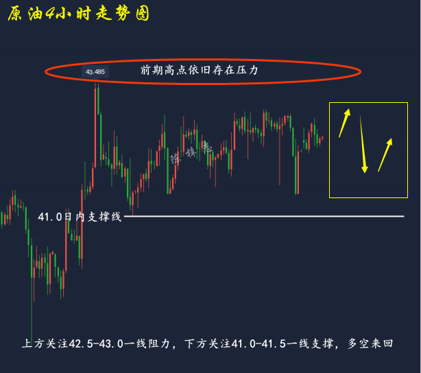 原油技术面来分析,日线上看,周一原油延续前几个交易日走势,继续持于中上轨盘整运行,日线录得带上下影线的小阴;4小时上看,周一原油持于中轨附近盘中涨跌转换,当前布林带处于开口期,MA均线在走出双金叉后MA5日线拐头向下,KDJ随机指标三线并拢向下,MACD指标红色动能柱开始出现,快慢线粘合向前,综合来看,原油日内或将延续区间运行,不做过多分析,在没有有效消息面打开原油局势,日内操作依旧对高空低多,上方关注42.5-43.0一线阻力,下方关注41.0-41.5一线支撑。