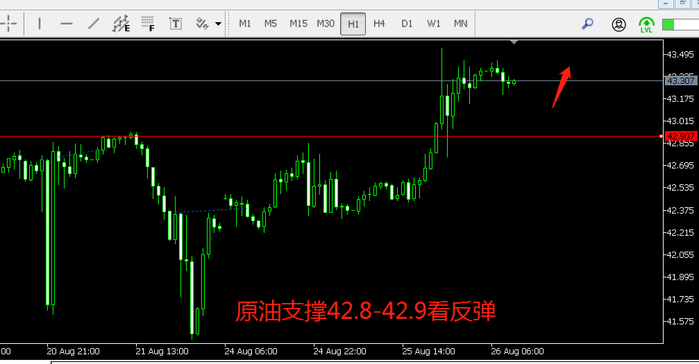 原油的多头终于开始爆发,真是千呼万唤始出来,所以今天不用多说继续保持看涨的思路去对待就好,日线上MA5.10已经开始形成金叉,这是积极的看涨信号,而H4也是呈阶梯反弹,支撑位于H4的MA10的位置也就是42.8,这也是昨天油价上破后回踩的低点位置,所以今天我们就在42.8看涨,止损42,看44-44.5