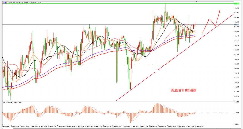 上周美原油走势震荡,曾经一度上涨至43.82美元/桶,创出了近5个月以来的新高,上涨的主要原因是上周的两场飓风影响了美国的产能,并且周三公布的美国EIA原油库存数据连续第五周录得下降,再加上美元指数走弱,国际贸易局势传来利好消息等,都给油价提供了一定程度的利好作用;但由于飓风“劳拉”的破坏程度小于预期,世界公共卫生事件的影响仍在持续,美原油的多头投资者仍然有所顾忌,导致油价在上周涨幅受限,周K线收报43.00美元/桶,整体的上涨幅度并不大。