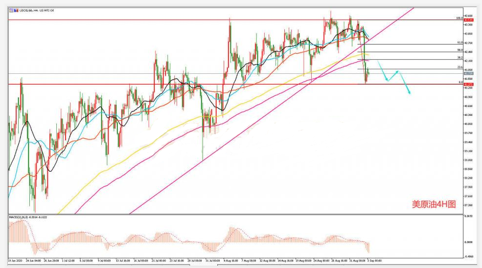 从下图美原油4小时周期图来看,美原油昨日走出了大幅度的下跌,累计下跌了近2美元,目前来看,下跌的动能较强,预计后市还会下跌。从均线上来看,4小时级别的EMA144均线和EMA169均线都已经被跌破,并且MA60均线也成为了压力线,后市走空的概率较大,下图中为美原油昨日的下跌波段画出了一段黄金分割线,预计38.2%的反弹处将成为今日的阻力位,故日内操作建议在该阻力位置附近埋伏空单。