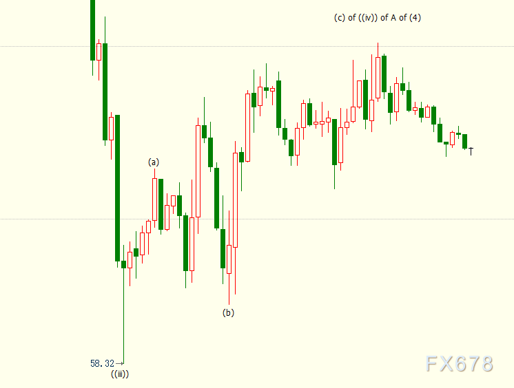 小时图上看,NYMEX原油料在61.80美元附近结束反弹((iv))浪走势,并开启下行((v))浪走势。((iv))浪和((v))浪都是自67.98美元开启的下行A浪的子浪。