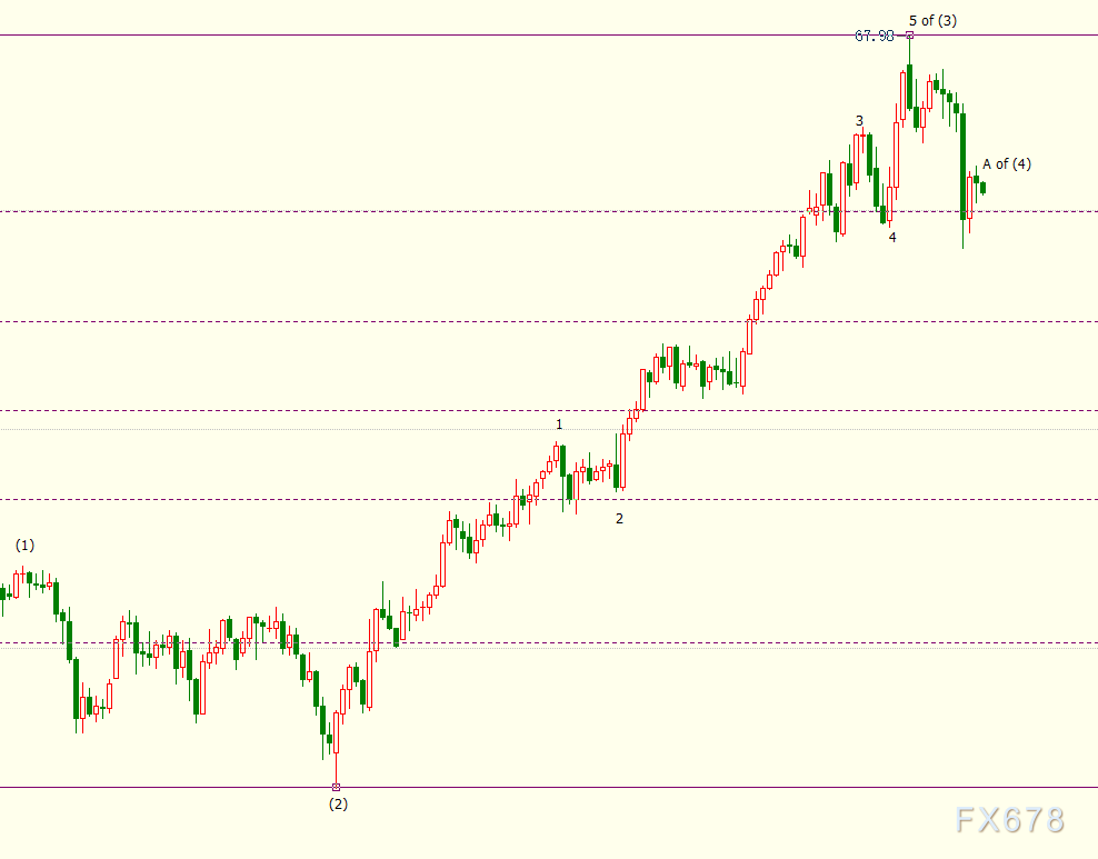 日线图上看,NYMEX原油已在67.98美元开启回调(4)浪走势,(4)浪料呈现ABC三子浪形态。A浪料跌向54.88美元,它是自33.64美元开启的上行(3)浪走势的38.2%斐波那契回档位。