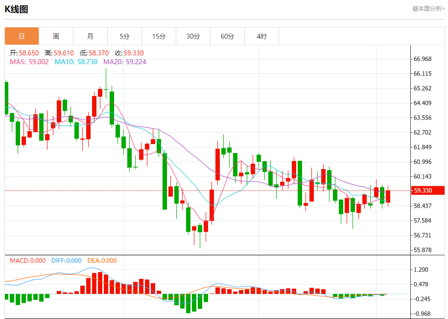 12月5日,原油在周五亚洲交易时段的交易价格约为59.45美元。随着美国原油库存增加,WTI指数下跌,显示供应过剩。 能源信息署(IA)周三发布的数据显示,截至11月23日当周,美国原油库存增加了57.4万桶,而前一周为277.4万桶。这一数字高于市场共识的-190万桶。 美国美联储即将降息四分之一点,可能会增强2025年能源需