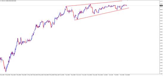 【技术点评】:H4周期显示,油价沿上升趋势线上行,价格低点逐渐走高。
