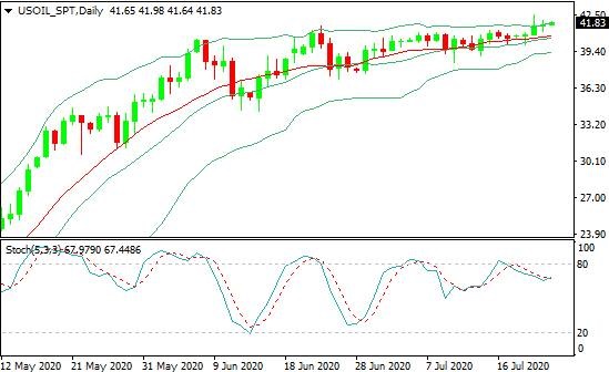 日图:保利加通道上扬,油价紧随上轨发展;14和20日均线温和看涨;随机指标走高。